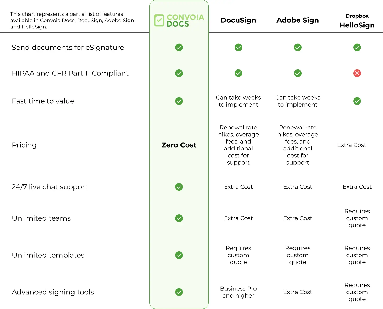 Compare Convoia Docs with other eSignature solutions using the chart below.