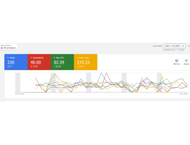 Truck N Trailer’s Google Ads account showed a rapid month-over-month improvement in December 2025. Clicks increased by 381, and conversions rose by 23 compared to the previous month. Cost per conversion dropped to $88.34 while average CPC declined to $5.06. The account scaled traffic efficiently, improved lead quality, and maintained cost control through ongoing optimization.